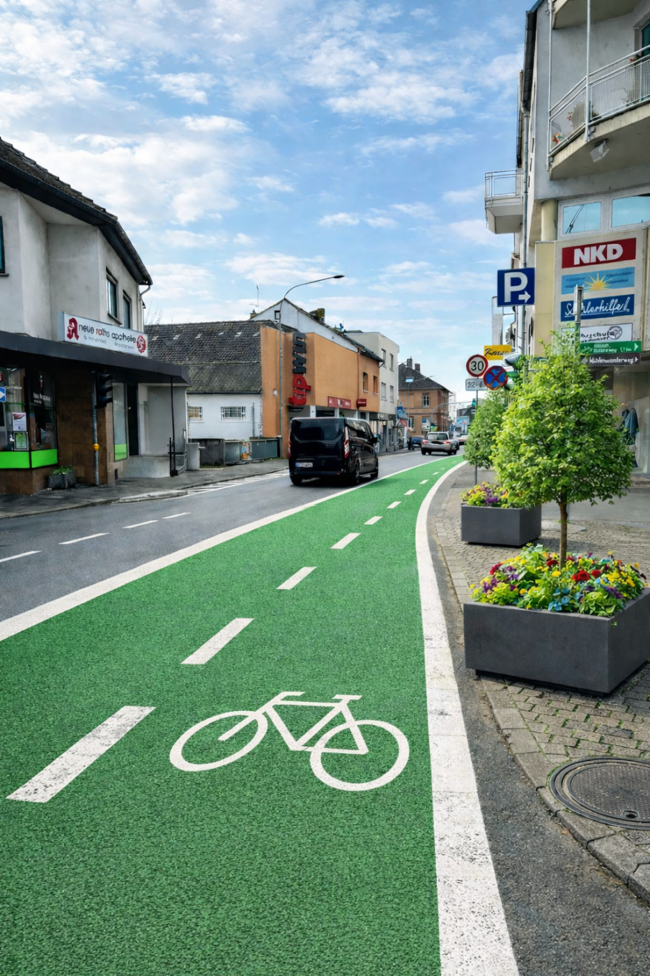 Diese Markierungen können bei Bedarf durch Pflanzkübel oder ähnliche Elemente ergänzt werden. Das erhöht die Verkehrssicherheit, verbessert das Stadtbild und trägt zur Lärmberuhigung bei. Wichtig ist ein pragmatisches Vorgehen: reversibel, finanzierbar und ohne aufwendige Umbaumaßnahmen.